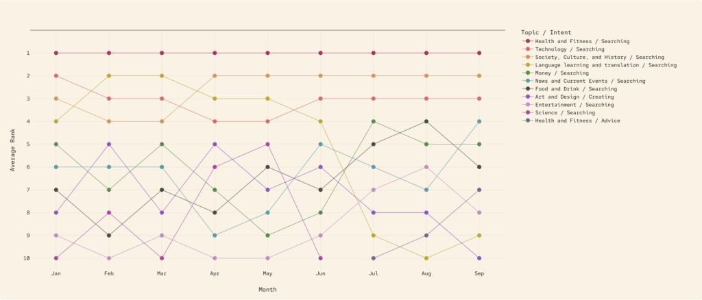 健康始终是最常见的主题,而有趣的是,与语言相关的聊天在年初达到高峰,娱乐相关话题则稳步上升。