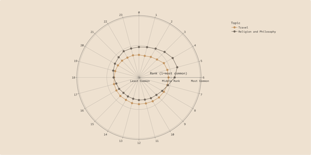 一天中每个小时旅行和宗教与哲学对话的平均排名。