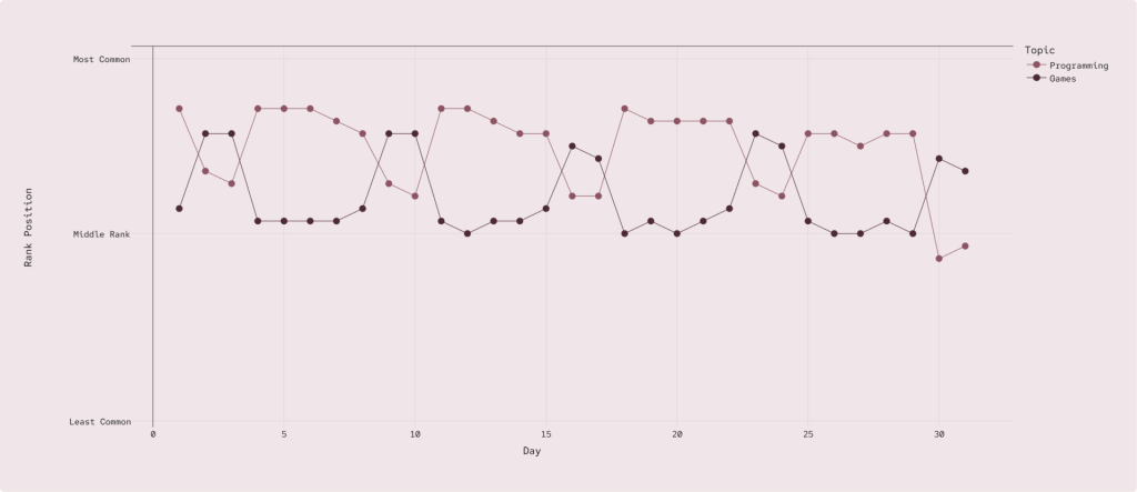 一周内编程和游戏的排名有明显变化,编程话题从周一到周五排名上升,而游戏话题在周末突出。