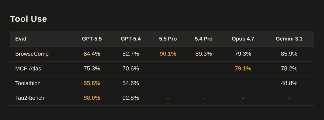 OpenAI 拿出了一张 9 项核心指标的对比表,横向对比 GPT-5.5、GPT-5.4、GPT-5.5 Pro、GPT-5.4 Pro、Claude Opus 4.7 和 Gemini 3.1 Pro