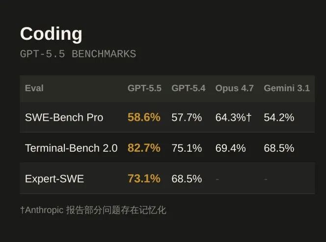 SWE-Bench Pro 上 Claude Opus 4.7 报了 64.3%(GPT-5.5 是 58.6%),但 Anthropic 承认部分问题存在记忆化