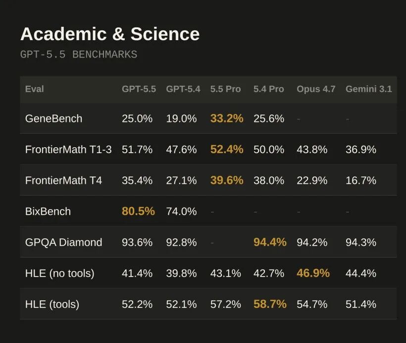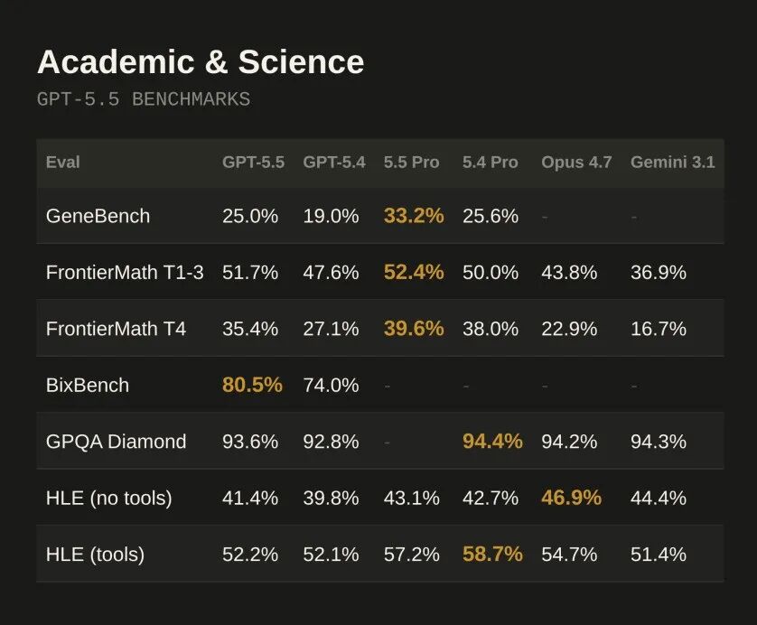 BixBench(真实生物信息学和数据分析 benchmark):GPT-5.5 得分 80.5%,GPT-5.4 是 74.0%