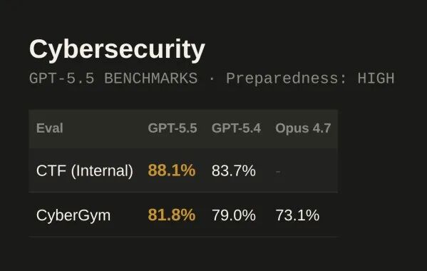 GPT-5.5 的网络安全能力被 OpenAI Preparedness Framework 评为 High(生物/化学能力同为 High)。没有达到 Critical 级别