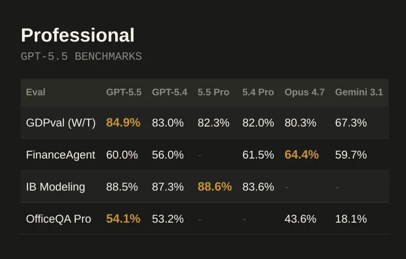 GDPval44 个职业知识工作测试,胜出或平手率 84.9%,vs GPT-5.4 的 83.0%,vs Claude Opus 4.7 的 80.3%