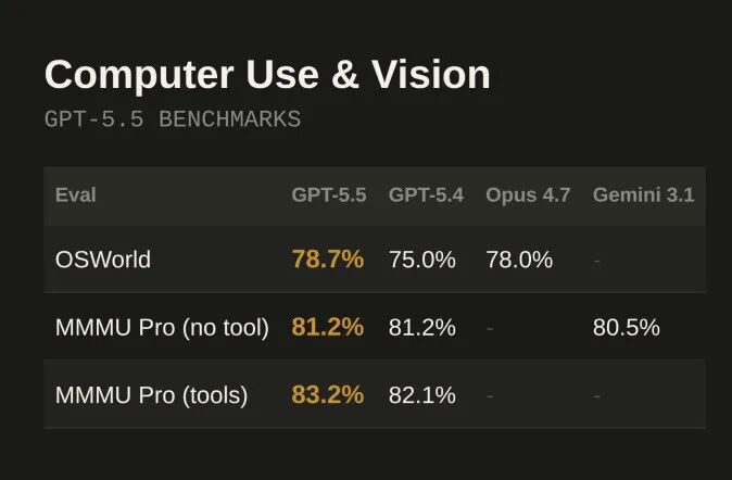 OSWorld-Verified模型独立操作真实电脑环境:78.7%,vs GPT-5.4 的 75.0%