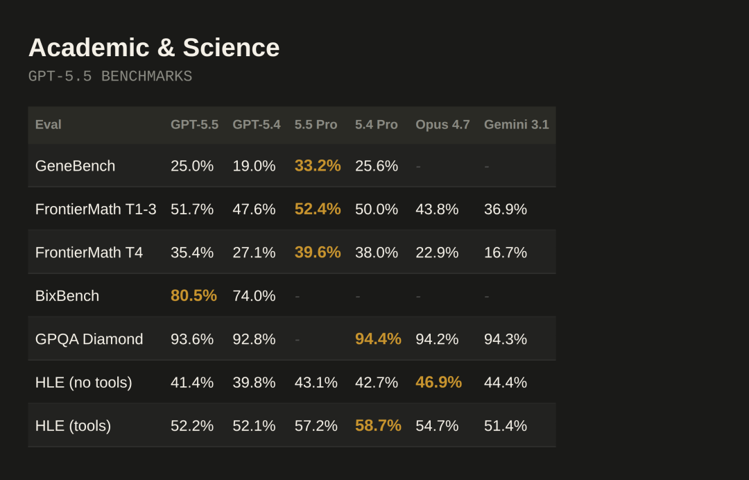 Humanity’s Last Exam(带工具)上 GPT-5.4 Pro 的 58.7% 高于 GPT-5.5 Pro 的 57.2%