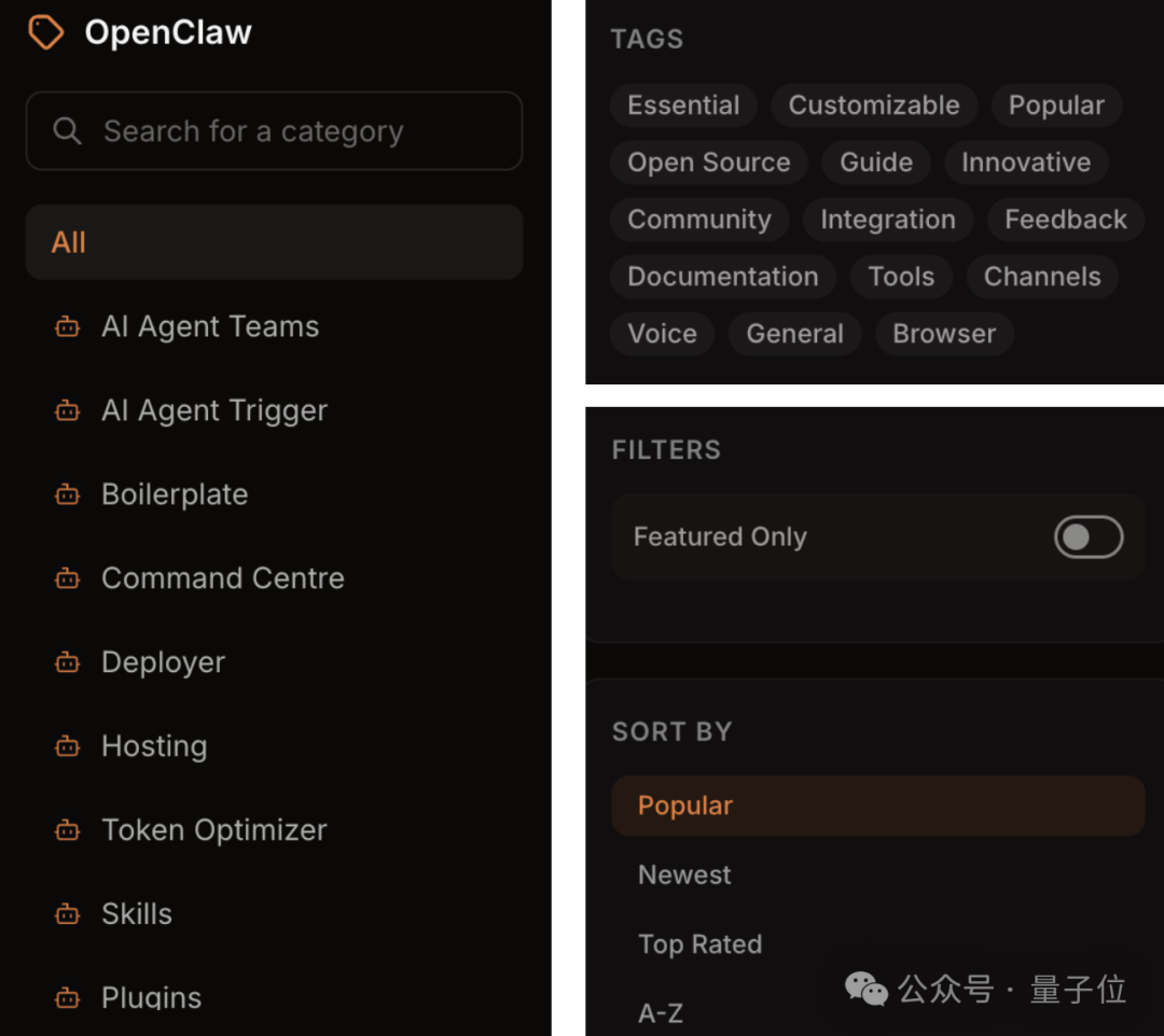 AI Agent Teams(Agent团队协同工作方案)AI Agent Trigger(触发Agent执行任务的机制/工具)Boilerplate(代码模板)Command Centre(控制板)Deployer(部署工具)Hosting(托管服务)Token Optimizer(Token优化工具)Skills(扩展特定功能的技能模块)Plugins(增强OpenClaw能力的插件)