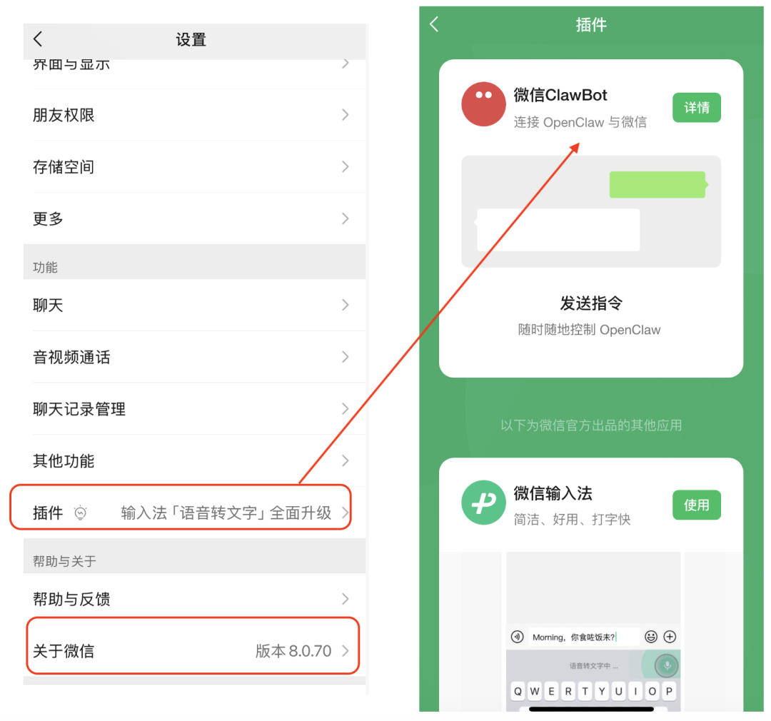 在最新的微信里面,点击我的,然后在设置/插件 找到小龙虾的插件