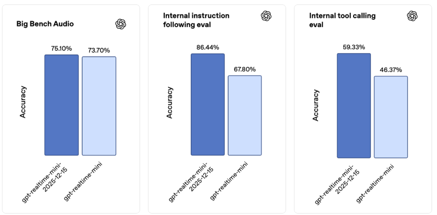 新的实时迷你版快照更适用于实时智能体,在指令执行和工具调用方面有显著提升。在我们内部的语音转语音评估中,与之前的快照相比,指令执行准确率提高了 18.6 个百分点,工具调用准确率提高了 12.9 个百分点,并且在 Big Bench 音频基准测试中也有所进步。