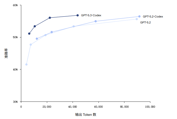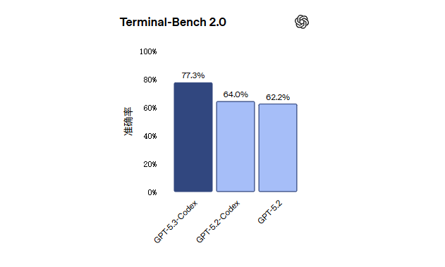 GPT‑5.3‑Codex 在 SWE-Bench Pro 上达到了顶尖 (state-of-the-art) 水平,该基准是对真实世界软件工程能力的严格评估。SWE-bench Verified 仅测试 Python,而 SWE-Bench Pro 涵盖了四种编程语言,且具备更强的防污染性、挑战性、多样性,也更符合行业实际需求。此外,它在 Terminal-Bench 2.0 上的表现也远超之前的纪录,该基准主要衡量像 Codex 这样的编程智能体所需的终端操作技能。值得注意的是,GPT‑5.3‑Codex 实现这些成绩所消耗的 Token 比以往任何模型都要少,从而让用户能够构建更多内容。