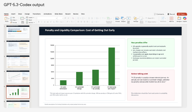 通过使用类似于OpenAI 之前 GDPval 测试中所用的自定义技能,GPT‑5.3‑Codex 在专业知识型工作方面也表现强劲。根据 GDPval 的衡量,其表现与 GPT‑5.2 持平。GDPval 是 OpenAI 在 2025 年发布的一项评估,旨在衡量模型在 44 种职业中明确定义的知识型工作任务上的表现。这些任务包括制作演示文稿、电子表格以及其他工作产出。