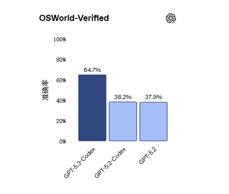 OSWorld 是一个智能体计算机使用基准测试,要求智能体在视觉桌面计算机环境中完成办公生产任务。GPT‑5.3‑Codex 展示了远强于以往 GPT 模型的计算机使用能力。