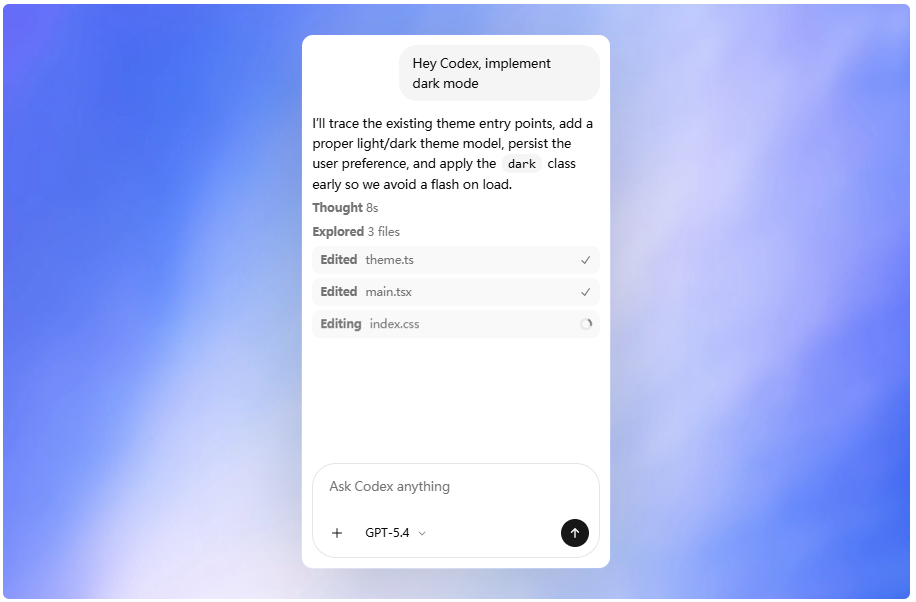 随着模型能力变得愈发强大,差距已从“智能体能做什么”转向“人类如何轻松地针对多个并行工作的智能体进行交互、引导和监督”。Codex 应用让管理和引导智能体变得更加简单,而现在配合 GPT‑5.3‑Codex,交互性得到了进一步提升。通过这一新模型,Codex 会提供频繁的状态更新,让你在它工作时随时掌握关键决策和进展。你无需等待最终输出,而是可以进行实时交互 — 提出问题、讨论方案并引导其走向解决方案。GPT‑5.3‑Codex 会详述其正在执行的操作,响应反馈,并让你全程参与其中。