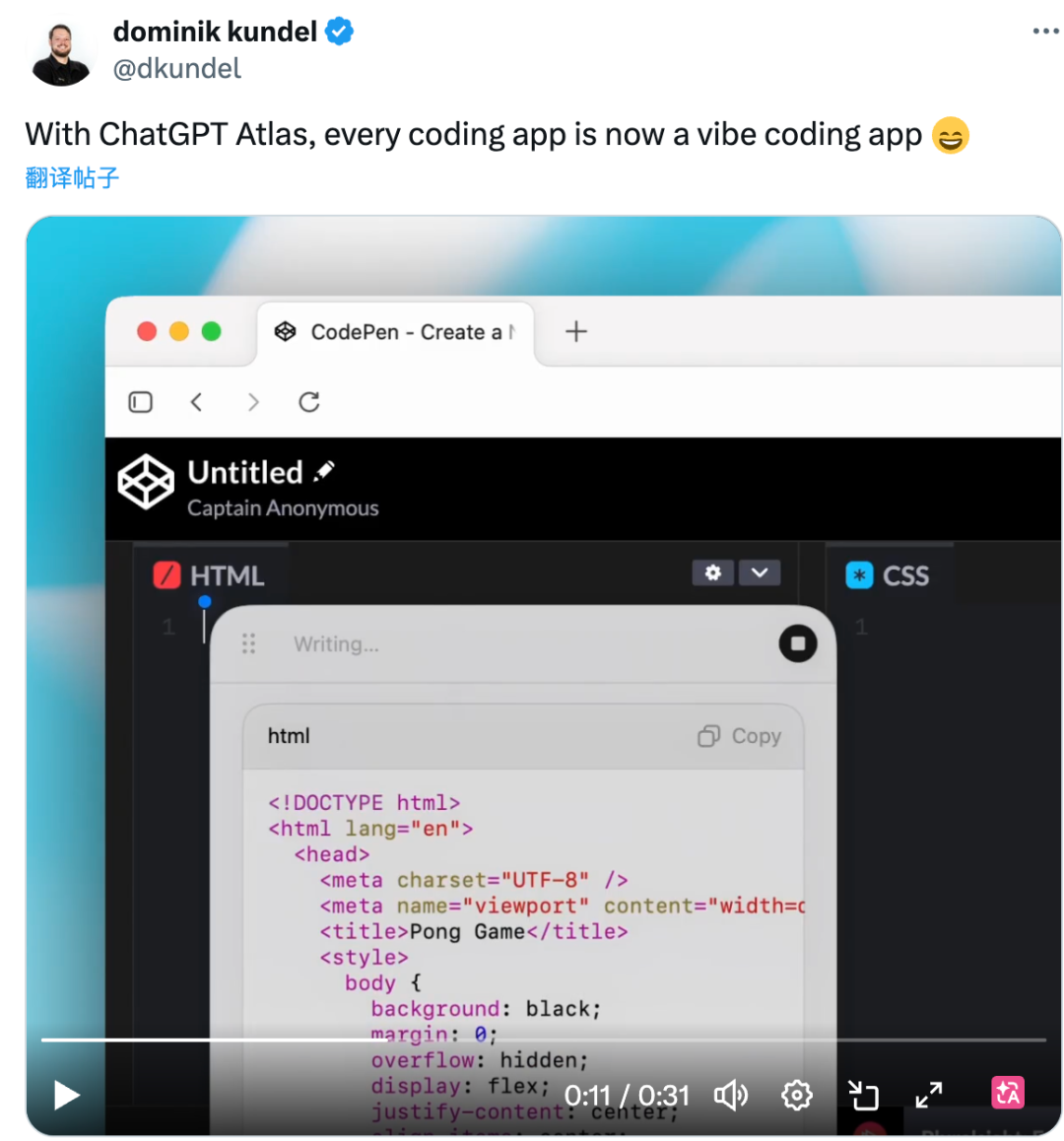 开发者 Dominik Kundel 在 X 上写道:「有了 ChatGPT Atlas,每个编程应用现在都变成了 Vibe 编程应用。」