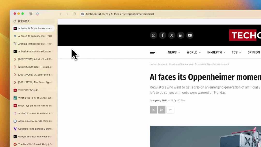 拿到任务后,Tabbit 就开始搜集资料,逐篇阅读并提取重要信息,同时将已打开的资料都保留在标签栏,方便我们后续回顾。